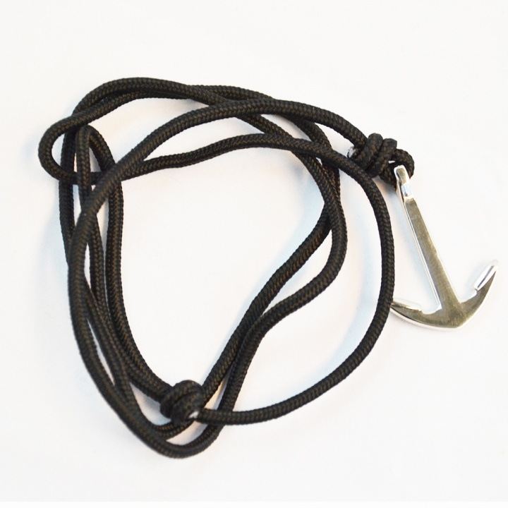 Ett stilrent armband med ett silverpläterat ankare som fäste. Snurra det svarta armbandet runt handleden och justera öglan för önskad passform. Stilrent, snyggt och passar alla tillfällen.
