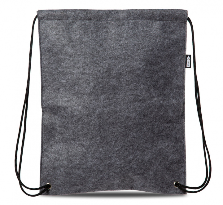 Väska med dragsko tillverkad av grått filttyg gjord av 100% R-PET. När den är fylld är det bara att dra ihop och hänga på axeln eller bära som en ryggsäck. Praktisk, stilren och prisvärd produkt.